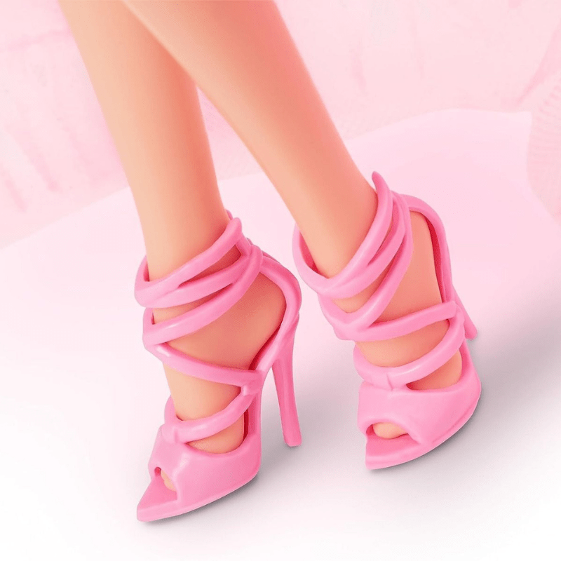 - e doll has luxurious blonde hair pulled back from her face with a pearlescent headband. She also comes with pearl earrings, strappy stilettos, and a doll stand.