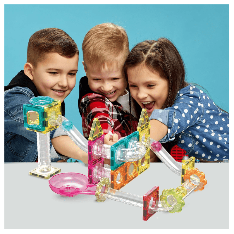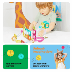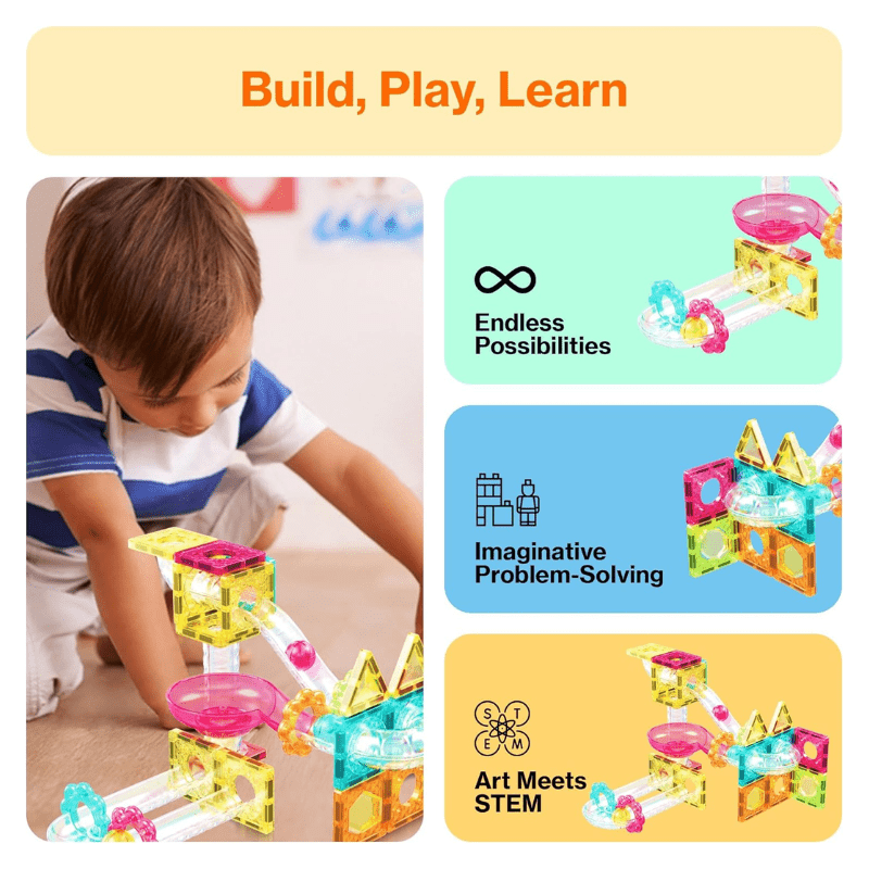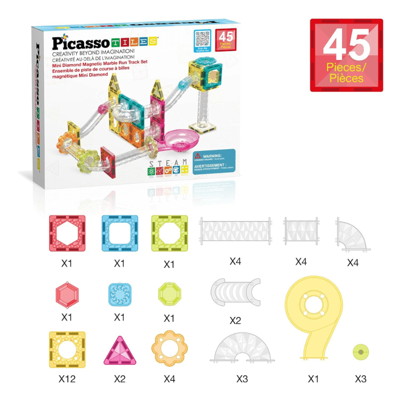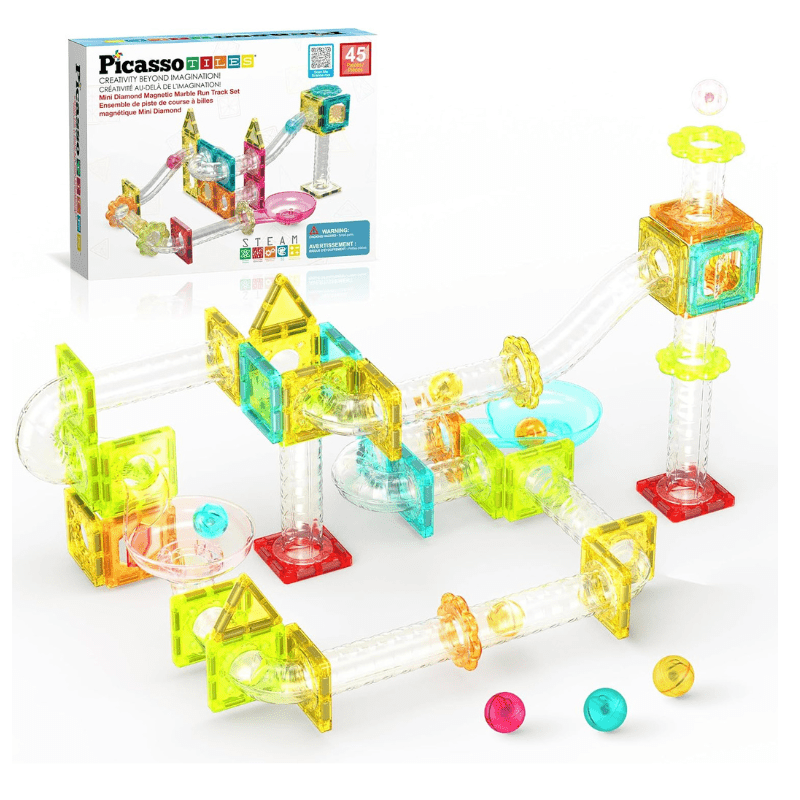 Explore creativity on-the-go with Picasso Tiles travel-sized marble run and magnetic tile fusion combo building set (SKU: PTMG45). Combining two building toys into a compact design. This travel set guarantees creative fun anywhere you go. Immerse yourself in play with innovative shapes and mini diamond tiles, nurturing problem-solving skills and critical thinking even in smaller spaces.